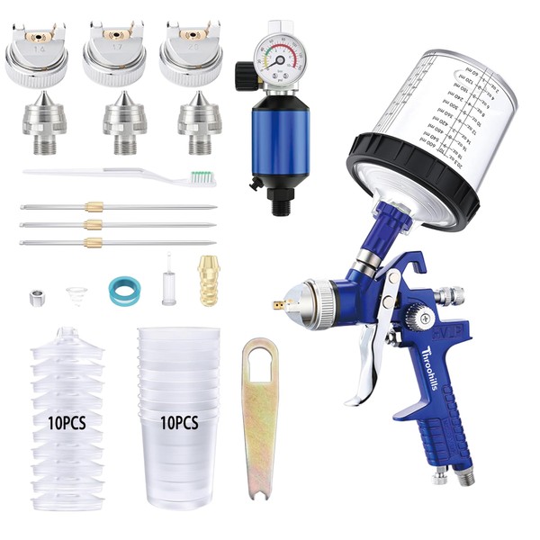 Throohills Professional HVLP Spray Gun, 1.4/1.7/2.0mm Nozzle HVLP High Atomization Flow Adjustable Pneumatic Gravity Spray Gun (Blue)