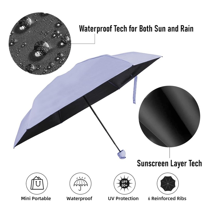 - High-quality material and elegant design: the mini umbrella has 6 reinforced metal ribs and an aluminium alloy handle, lightweight and strong, durable and reliable. The flexible structure of the umbrella does not break in strong winds. The umbrella body is both lightweight and robust and durable. The water-repellent umbrella cover made of high-density material dries quickly and allows space-saving storage after use, the vinyl coating allows quick drying of the retractable umbrella surface and protects against UV