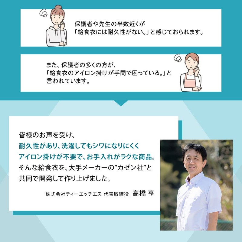 - 『プロを輝かせる服』で定評のある大手メーカー"カゼン社"と白衣通販のプロ"THS-白衣NET"がコラボし、 出来上がった信頼の児童給食エプロンセットです。