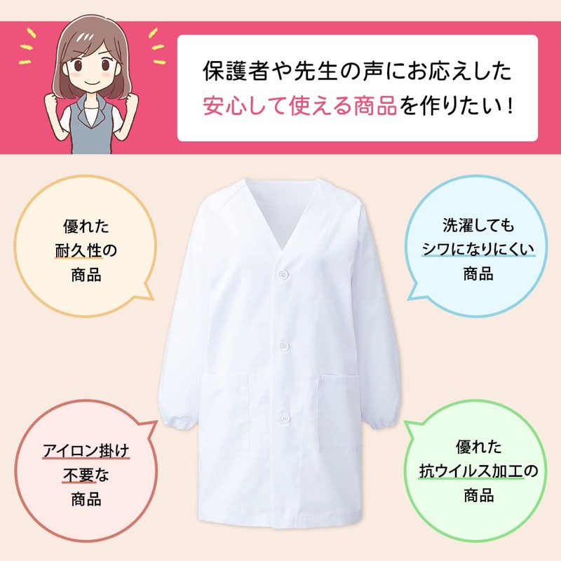 - ノンアイロン加工で「洗って干すだけ」のイージーケアを実現。 保護者のお手入れの負担を軽減します。 しっかりとした生地と縫製で、耐久性に優れています。