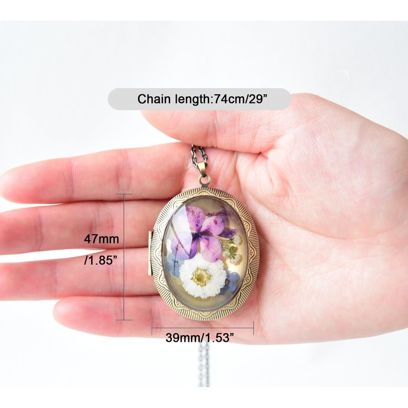 - 1.Unique Design:Oval shape handmade pressed flower locket pendant necklace, with an engraved pattern on the bronze locket, containing real pansy flowers and leaves. This locket necklace is designed to hold photos, allowing you to insert one or two pictures.