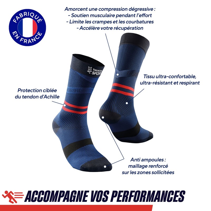 - Ankle support during sports: our running compression socks, made in France and developed with top athletes, which reach to the middle of the calf, provide a degressive compression that is strongest in the ankle area and gradually decreases along the calf. These socks are suitable for wearing during sports (jogging, trail running, marathon, cycling...), for athletes who prefer to leave their calf uncovered.