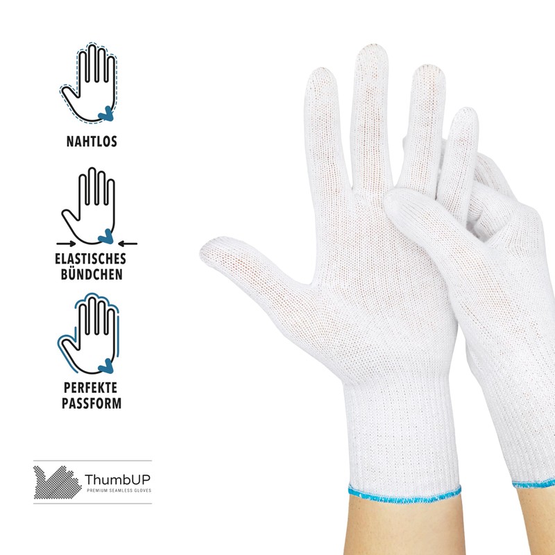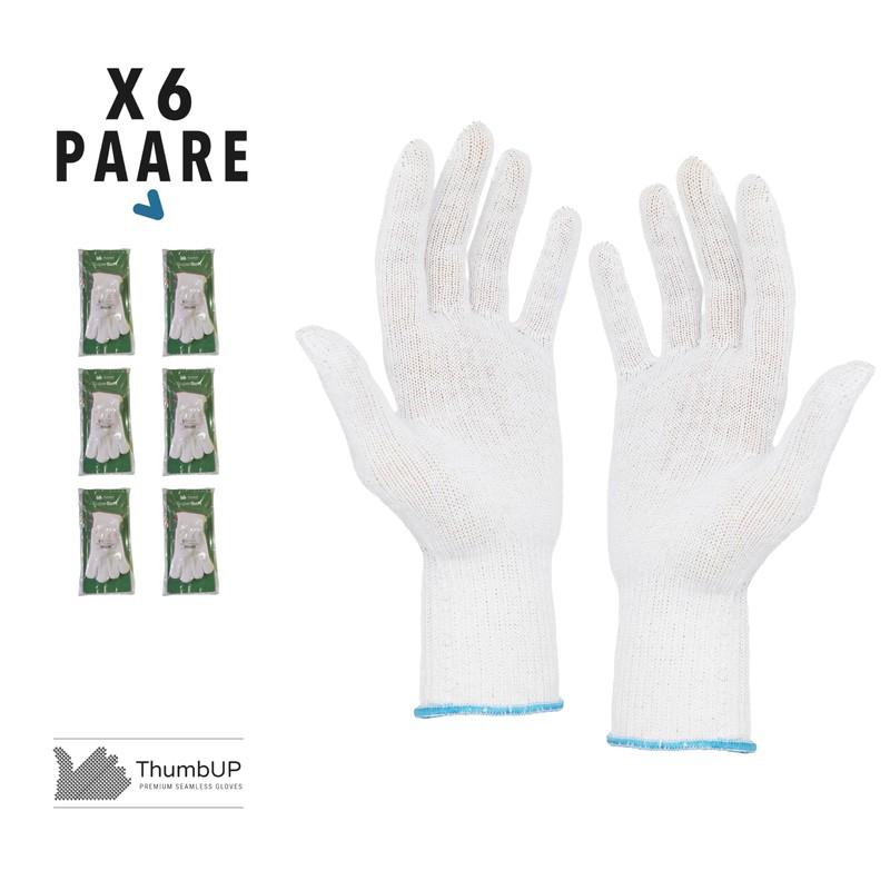 ThumbUP -Supersoft Pack of 6 Pairs 100% Cotton Gloves, for Right and Left Handed Users, Seamless, Elastic Wrist, Washable, White, Size M