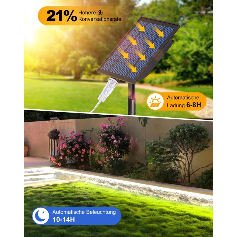 - Solar powered and USB Powered: The solar light strip has been upgraded with a larger solar panel, and the solar light strip can work for 10-12 hours after charging for about 8 hours during the day