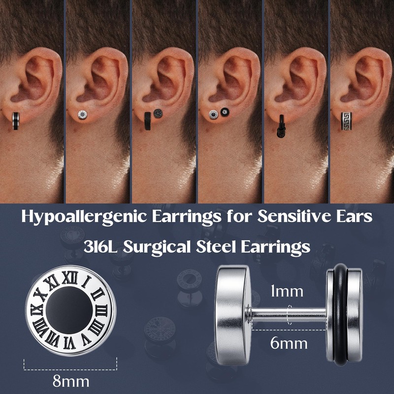 - Hypoallergenic Mens Earrings studs:These cool men's stud earrings are just the right size, they don't look too over the top, and they are versatile and eye-catching for daily use. It's designed with men's ears in mind for a snug fit, and the hypoallergenic 316L surgical steel earrings is suitable for sensitive ears. The simple and fashionable metal styles add unique charm and personality to the wearer