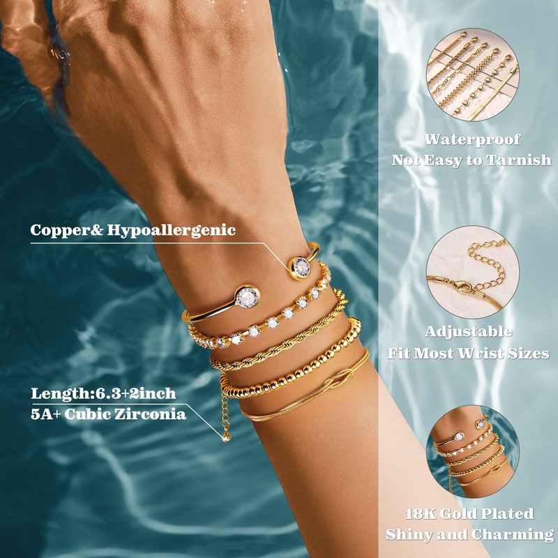- 【3-6Pcs18K Gold Plated Bracelet Set】This versatile women's gold bracelet set features timeless designs: Snake Chain, Tennis Bracelet, Cuban Link bracelet, Figaro Chain, and Open Cuff Bangle. Mix & match styles for a stacked look or wear individually for minimalist elegance. Crafted with 18K gold plating over premium copper, these bracelets for womens gold deliver luxury shine without tarnishing or skin irritation