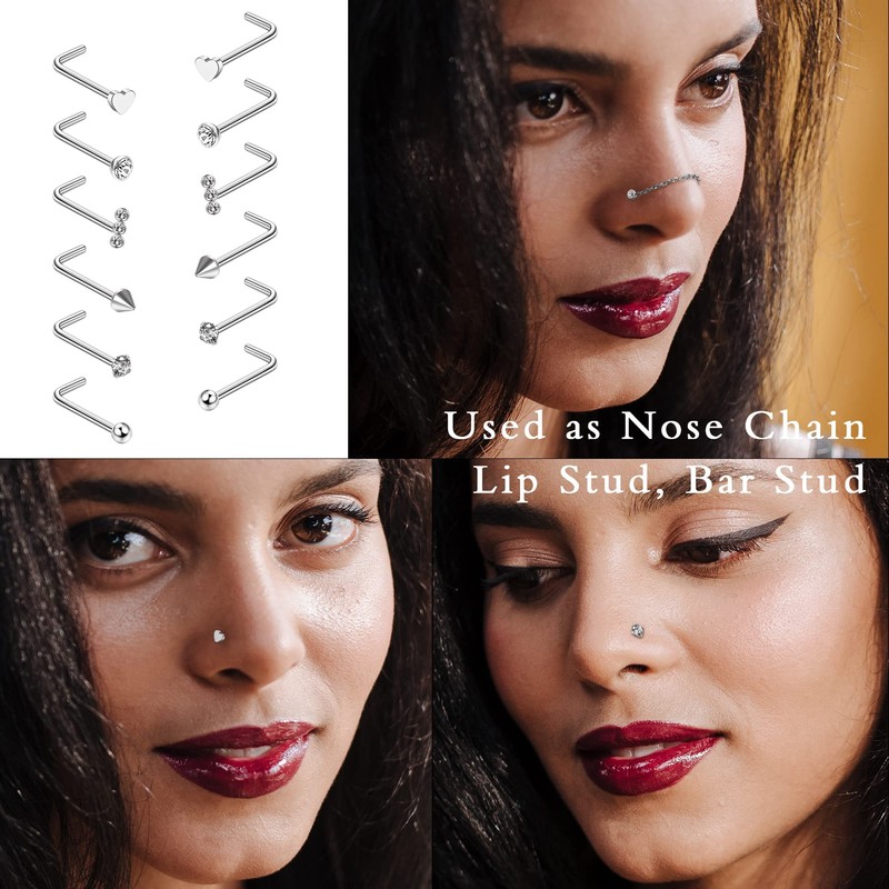 - 【NOSE CHAIN】One order you will receive 12 pcs L shaped nose stud and 10pcs shain. Nose stud chains include single and heart chain, nose studs include balls, heart, triangle and CZ. Variety styles give you a diverse sense of experience, different styles chains with nose studs can meet your different dressing needs.