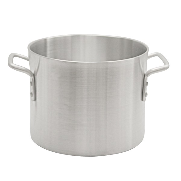 80 quart aluminum stock pot. Mirror polished stock pot with commercial thickness for efficient heating. Dent resistant surface to endure duty in a professional kitchen. Easy to clean. Available from 8 to 200 quart capacity. NSF approved. Stock pot lid available sold separately.