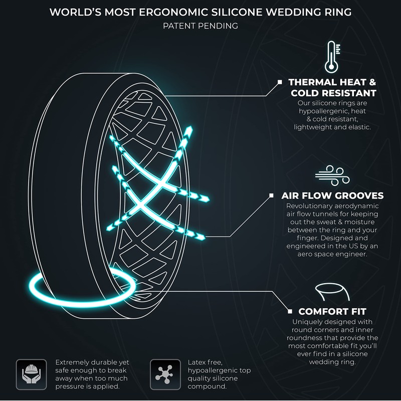 - A Must For An Active Lifestyle – Our silicone flexible wedding ring have an awesome smooth ergonomic design on the top combined with a perfect comfort fit design on the inside. All the combined with an amazing classic wedding ring design, create the perfect silicone wedding ring – by ThunderFit
