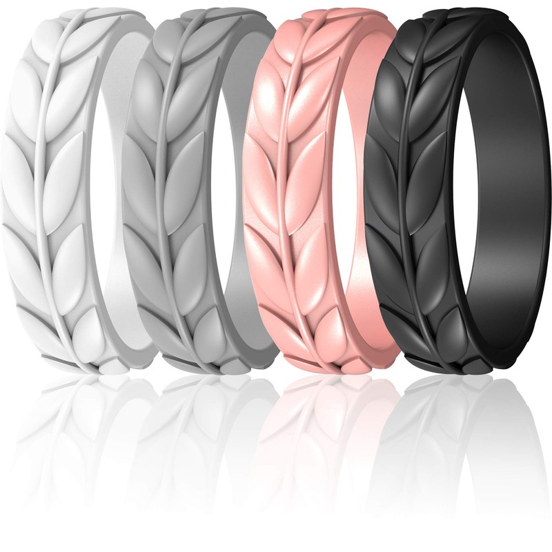 ThunderFit Silicone Rings for Women 4 Rings - Leaf Design Wedding Bands (White, Black, Rose Gold, Gray, 6.5 - 7 (17.3mm))
