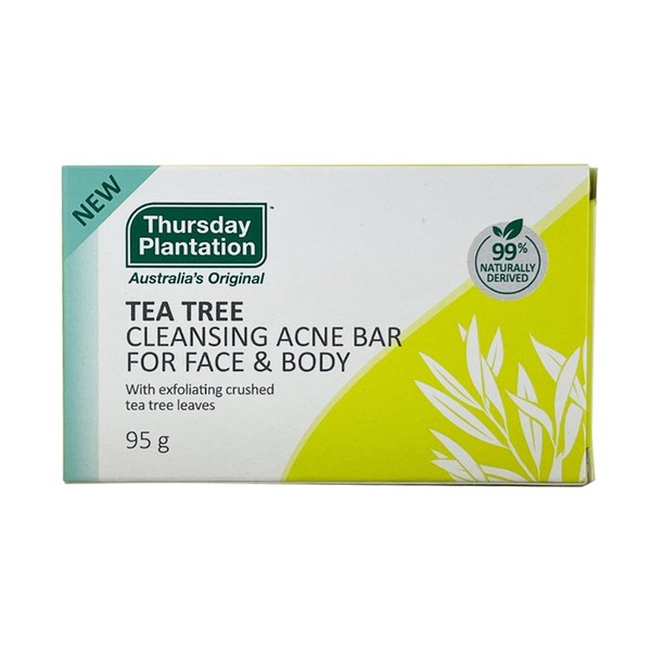 Thursday Plantation Tea Tree Cleansing Acne Bar for Face & Body, extracts even more goodness from the Australian tea tree plant by harnessing 100% pure Tea Tree Oil as well as crushed tea tree leaves, to cleanse, purify and exfoliate skin while helping to prevent the occurrence of acne and pimples. This product is vegan friendly. 99% naturally derived. Made in Australia.