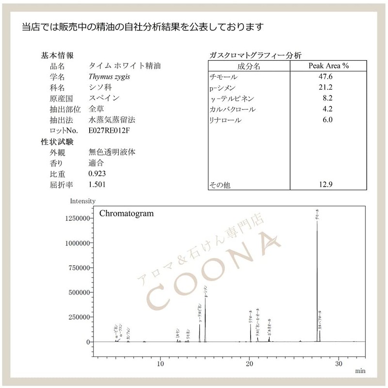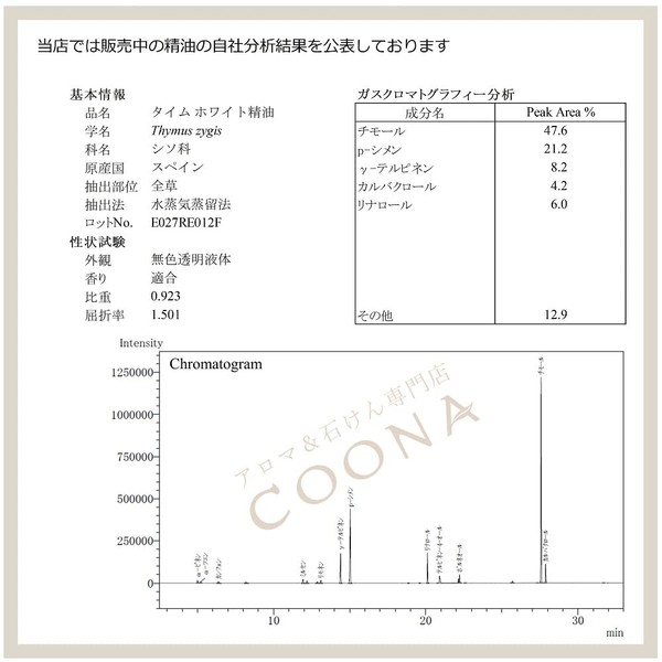 - Product Name: Thyme White Essential Oil (Thyme White), Also known as: Common Time, Time Chimol