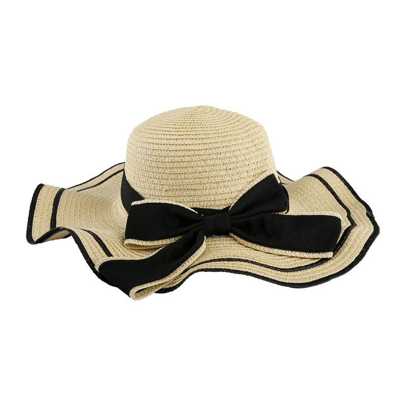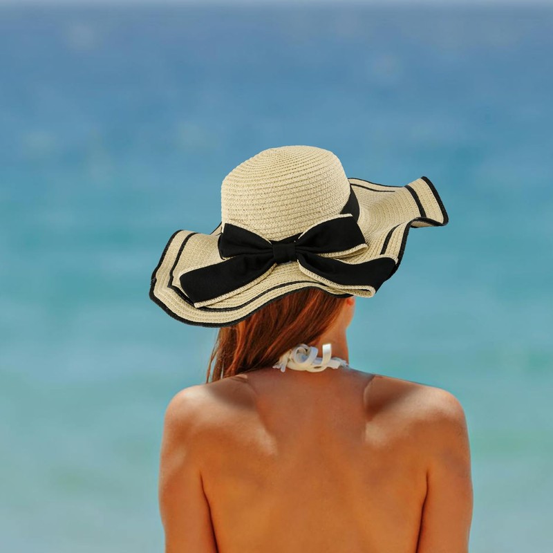 Thyonta Wave Wide Ribbon Bow Sweet Straw Hat Summer Sun Shade and Sun Protection Hat Suitable for Seashore, Beach, Holiday(Beige)