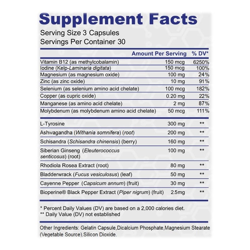 Thyroid Support - Ltyrosine, Iodine, Vitamin B12 Complex, Zinc, Selenium, Ashwagandha, Copper & More 30 Day Supply