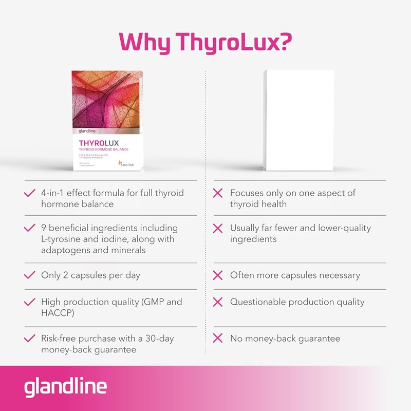 Thyrolux is crafted under the strictest pharmaceutical standards, following GMP and HACCP guidelines to ensure quality and safety. All raw materials undergo rigorous testing, including microbiological and heavy metal analyses, ensuring the highest product standards. Developed and manufactured by Sensilab, with over 15 years of experience in the supplement industry.