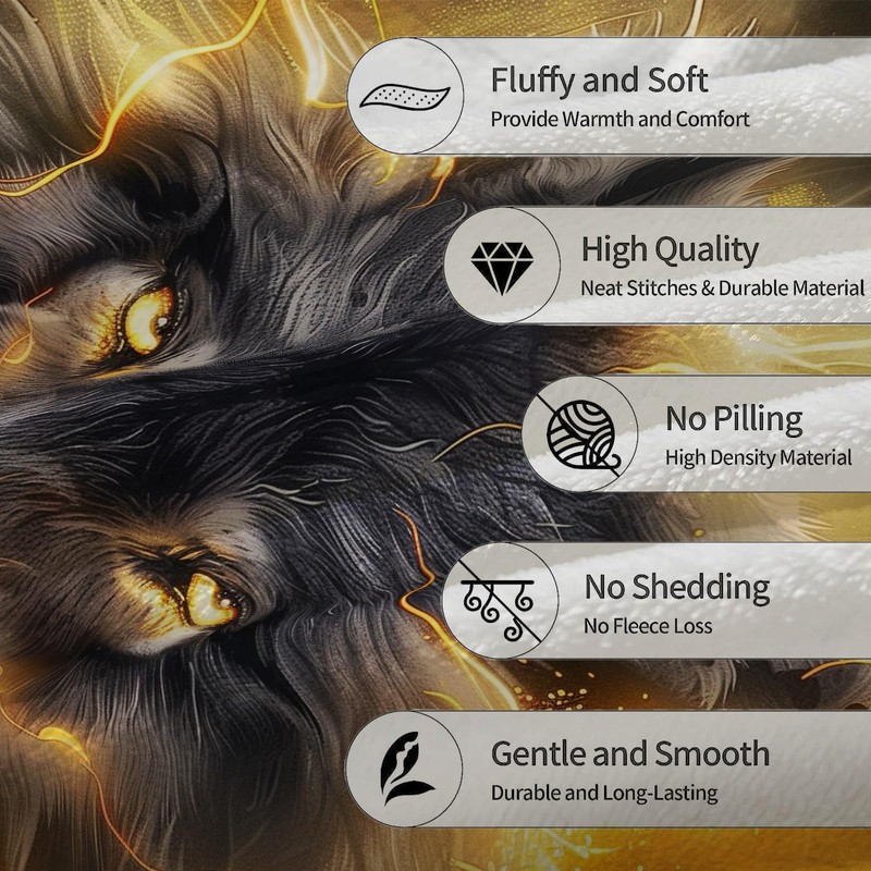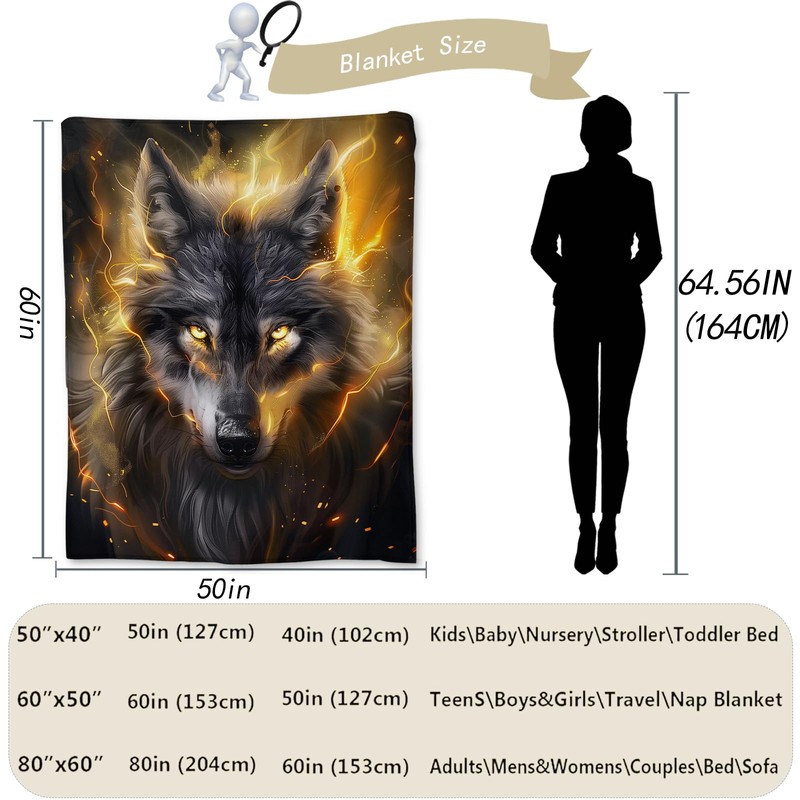 • [Striking Wolf Design]Immerse yourself in the mystical aura of the wild with our blanket's captivating wolf design. This artwork features a majestic wolf engulfed in vibrant flames and sparks, its piercing eyes glowing against a backdrop of dark and fiery hues. The intense, soulful expression and the dynamic interplay of light and shadow create a powerful image that adds a dramatic touch to any room.
