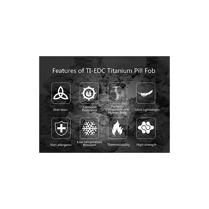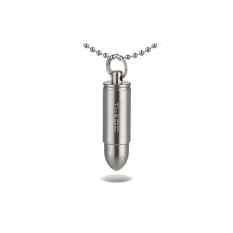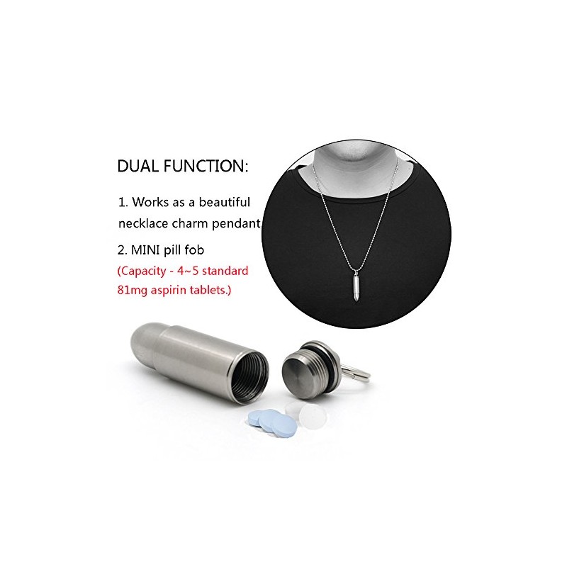This TI-EDC mini pill fob is good for small pills and holds 5 standard 81mg aspirin tablets. It is well polished and has a beautiful bullet design. It works as a small pill fob as well as a nice charm pendant. Package include: 1x TI-EDC Titanium Mini Pill Fob(LIFETIME WARRANTY), 1 x split ring, 1 x stainless steel necklace(Length:23~24"), 1 x extra O-ring. **WHY TITANIUM?** Lightweight and strong - It has the highest strength-to-density ratio of any metallic element. It weighs almost the same as aluminum but is stronger than steel. Corrosion resistant - It is highly resistant to corrosion even in sea water, aqua regia and chlorine. Biocompatible - It is non-toxic, non-allergenic and perfectly compatible with the human body. Durable - It is more durable than gold and has become a popular choice for designer jewelry. **Brand: TI-EDC** TI-EDC is a US registered trademark. We specialize in high quality Titanium and other metal made products. We attend to every detail from a user's perspective and strive to make the most beautiful and highest quality product. That means 100% user satisfaction - period.