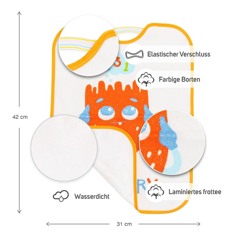 - Pack of 4 bibs with elastic closure: very useful to prevent your baby or the clothes they wear from getting dirty at meals. The bibs are waterproof, breathable and very soft and super absorbent