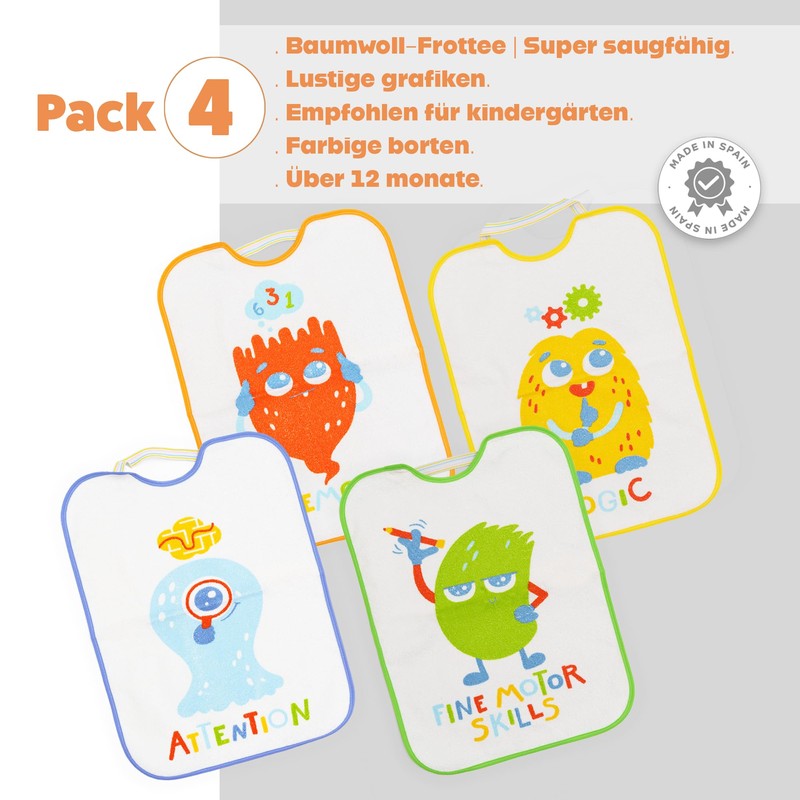 Ti TIN Pack of 4 Waterproof Baby Bibs with Rubber Closure, 90% Cotton, 10% Polyester with Vinyl Lining, Pack of 4 Bibs for Babies from 1 Year, Skills