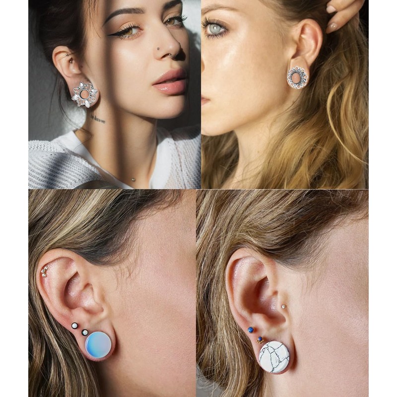- Each Lot Include 8 Pairs Ear Tunnels ,Same Size With Different Style .Include silicone tunnels opal stone gauges dangle gauges screw and double flare tunnels