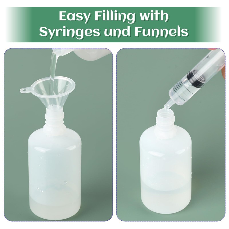 - Package contents: you will receive 18 x 50 ml liquid bottles, 18 x coloured caps, 18 x drip plugs, 2 x syringes, 2 x funnels, 1 x empty label. The dropper bottle measures 9 x 3.5 cm and are small and portable enough to be used at any time.