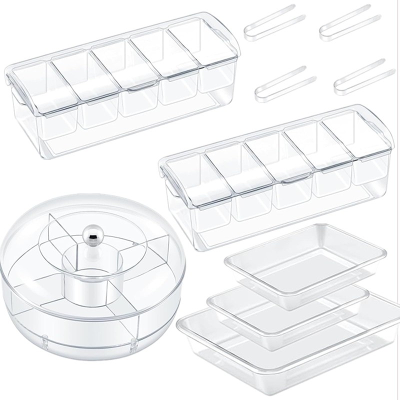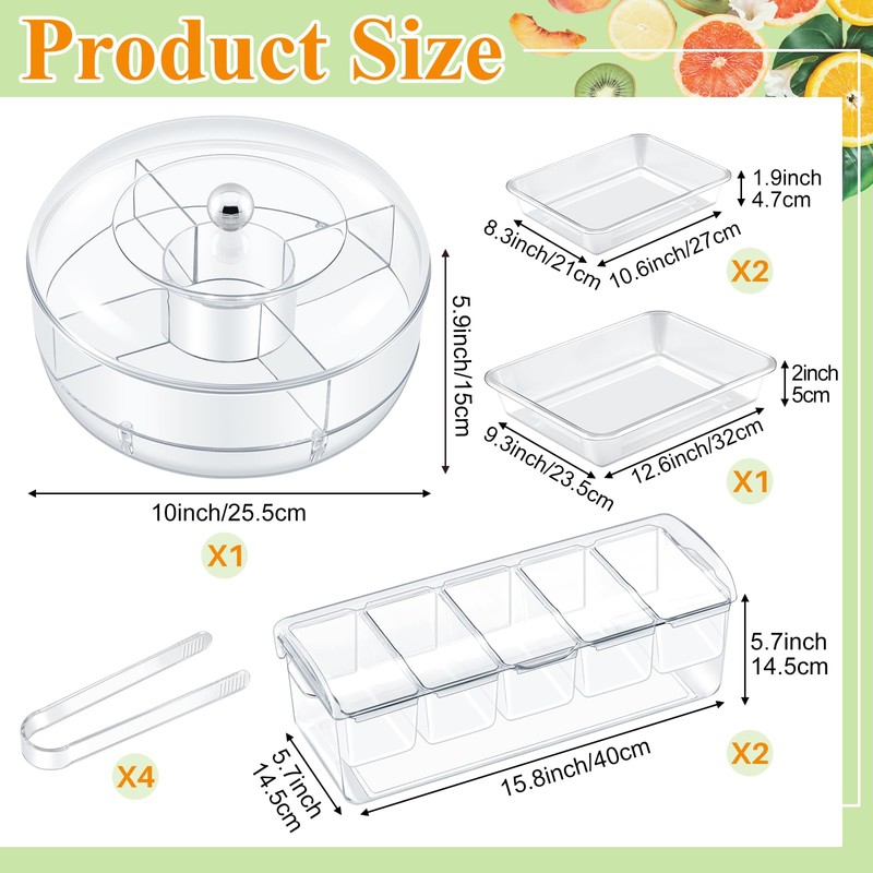 - Package Include: this chilled vegetable tray set include 2 square appetizer platter, 1 round rotating vegetable platter, 3 square food storage boxes of different sizes, and 4 plastic tongs; This collection is sure to cater to your varying daily requirements and party