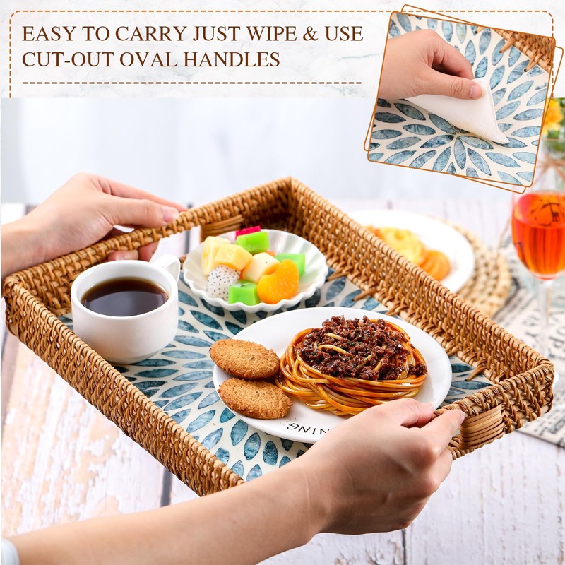 - Distinct Taste: the mother of pearl coating texture of rattan serving tray gives an oriental character that blends well with various styles; Under light, it reflects different colors adding a vibrant touch to your coffee tables, living room, and bathroom