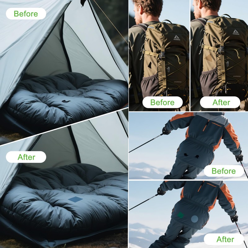 - Professional Grade Adhesive: The adhesive layer of the tent patch kit is firm and evenly distributed, able to withstand daily pulling and pulling, can be tightly bonded and naturally fit on the surface of nylon, PVC, vinyl, canvas, fabrics and other surfaces, with a long-lasting and firm repair effect
