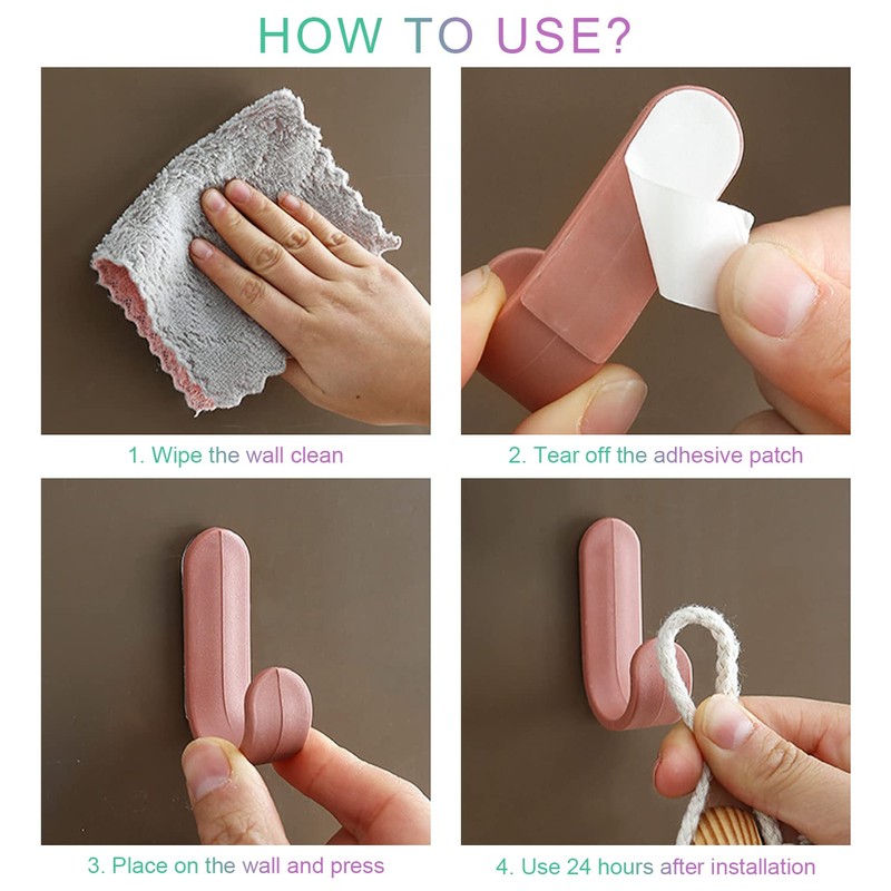 - Easy to install: wipe the wall, remove the plastic film on the back of the hook, stick the hook in a suitable position and press it a few times to stick firmly to the wall without punching. It can be easily disassembled, used 24 hours after installation.
