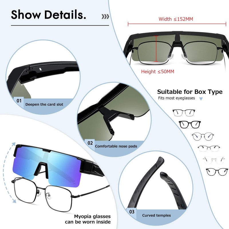 - SUNGLASSES FIT OVER GLASSES: Specifically crafted for glasses wearers, these polarized sunglasses boast a large frame and wide temples,enough to cover your glasses well. Suitable for people who wear glasses or with normal vision can also wear them alone.