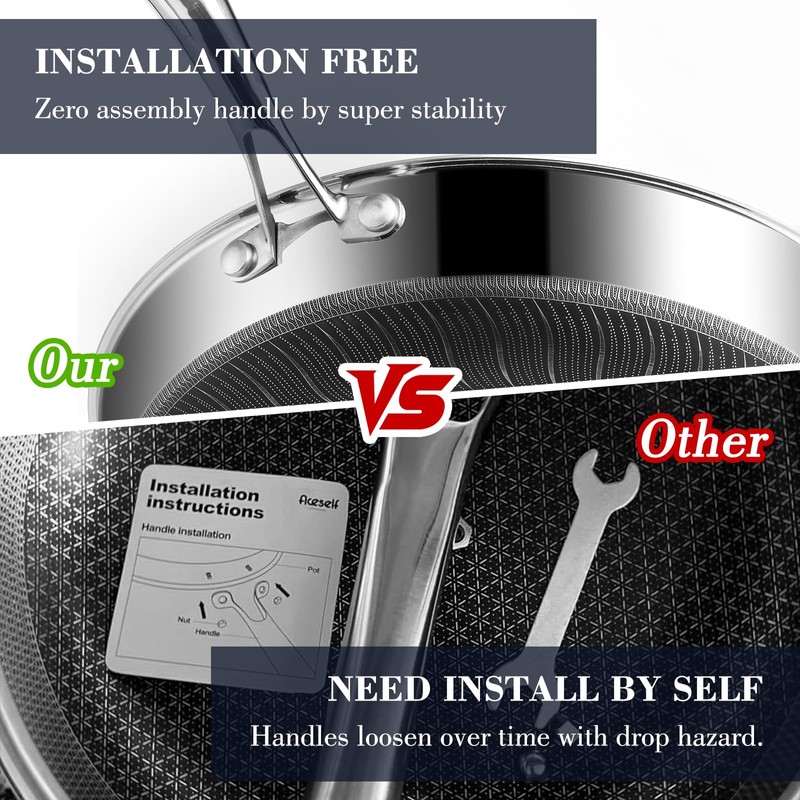 - 【Energy-Efficient Design-Cook Faster, Waste Less】 The tri-ply stainless steel with aluminum core heats twice as fast and retains heat longer, letting youcook crispy salmon or tender veggies on lower settings. Stainless steel cools quickly for safer handling, while even heat distribution reduces oil use by 30% for perfect browning every time.