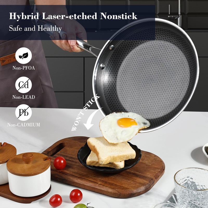 - 【Hybrid Non Stick Frying Pan Sets-No Sticking, Easy Scrubbing】 Upgrade to the Tibbicc non stick frying pan set for professional searing and effortless cleaning. The triple-layer stainless steel and aluminum core ensures even heat distribution, while the laser-etched scratch-resistant coating releases food instantly – eggs slide out and grease wipes clean without scraping. Durable enough for metal utensils and daily heavy use.