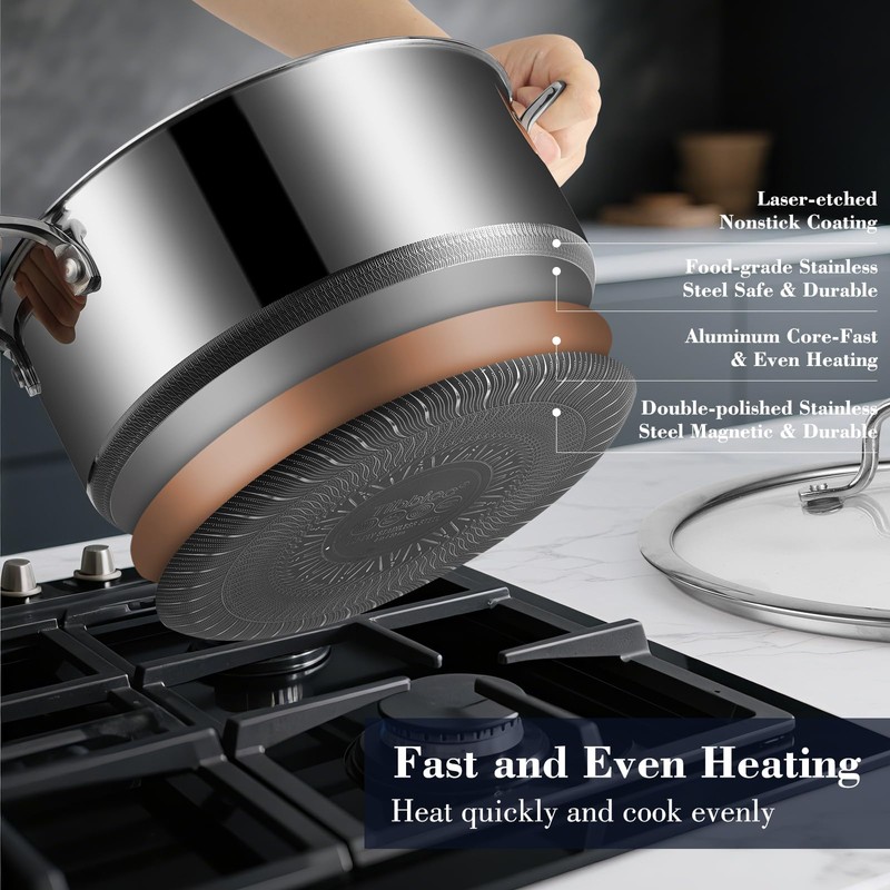- 【Hybrid Nonstick Excellence Experience】Professional cooking with the Tibbicc TriPly Hybrid Cookware Pots & Saucepan, whose triple-layer construction—stainless steel exterior, aluminum core, and laser-etched nonstick interior—ensures rapid, even heating and unmatched durability. Seamlessly blend stainless steel's searing power with nonstick ease for effortless food release and cleanup.