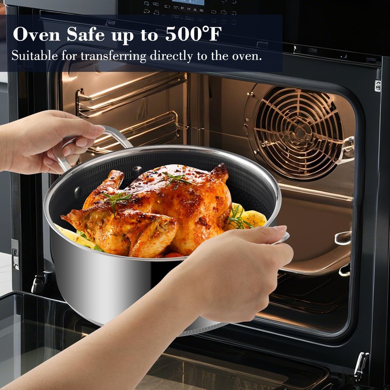 - 【All-Stovetop & Oven Ready】Engineered for versatility: compatible with induction, gas, electric stovetops, and oven-safe up to 500°F (260°C). Dishwasher-safe and built for daily use, perfect for sauces, soups, or milk without sticking. Durable riveted handles and scratch-resistant surfaces withstand rigorous cooking.