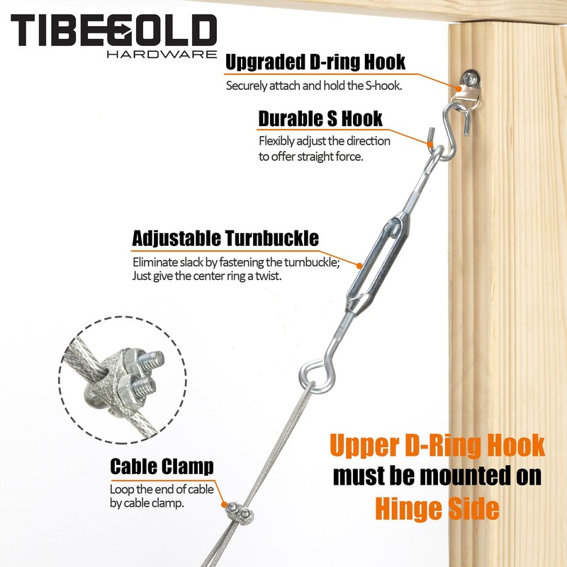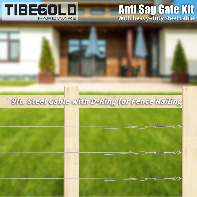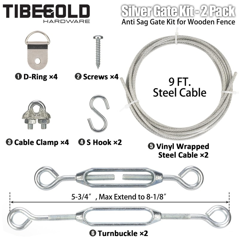 - Package Include: Anti-Sag gate kit comes with 2pcs 9ft vinyl wrapped steel cable, 2pcs turnbuckle, 2pcs S hook, 4pcs D-ring, 4pcs cable clamp, and 4pcs self-drilling screw. The vinyl fence repair kit can be used for internal and exterior applications. Can be installed on gates up to 6ft.high, 4ft.wide.