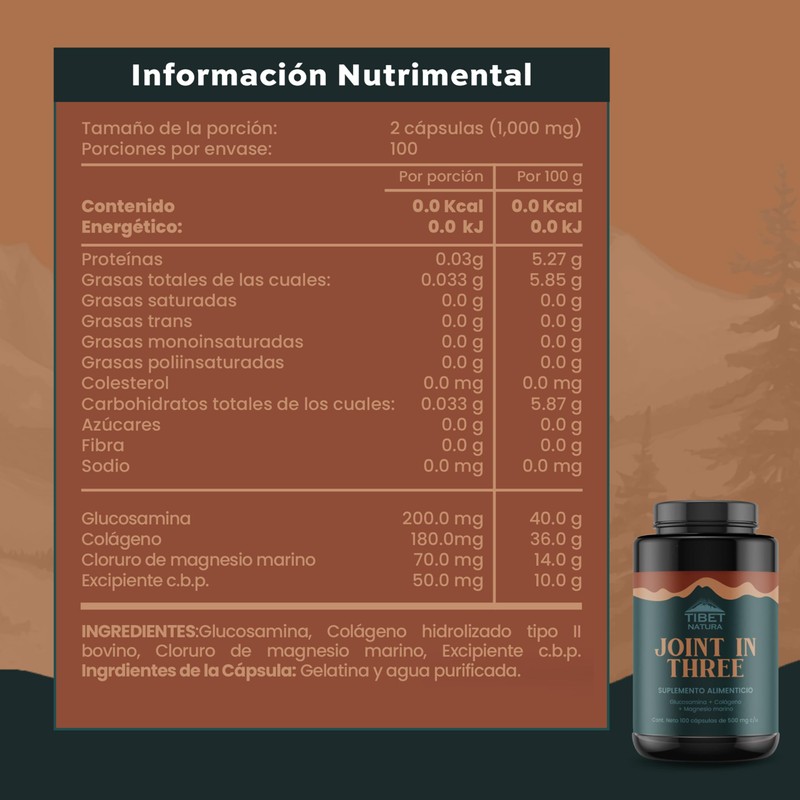 TIBET NATURA - Glucosamina, Colágeno Hidrolizado Puro y Magnesio - 100 Cápsulas 500 mg c/u - Magnesio Marino - Suplemento Alimenticio - Sin Azúcar - Joint In Three