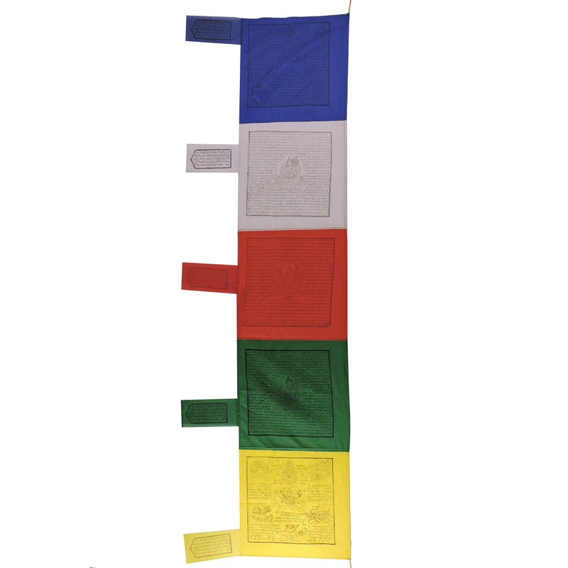 - . In Tibet, Nepal or India, you can see prayer flags on the hill top or on the temple or stupas. There are five vertical prayer flags are sewn together with five different colors which are red, yellow, green, blue and white and they represent five elements. The total length of this flag is 70 inches long and 19 inches wide and there are five flags total and each flag measures 19 inches by 14 inches.