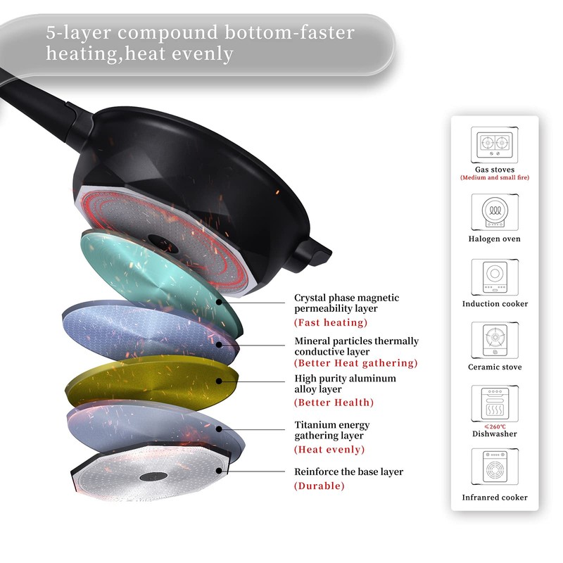 - Sturdy Wok Body&Oven Safe: The hard anodized aluminum is harder than stainless steel,Compared with cast iron pans and stainless steel pans, it is light in weight, it will never warp.it design 5 layers induction steel plate for rapid even heat distribution from edge to edge. it works on all cooktops(including induction stoves), and is oven safe up to 500°F/260°C.