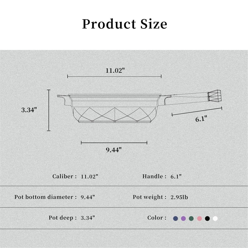 - Package & Size: Package: 1 x 5 qt All In One Pan,1 x Gift Box,1 x Pot Lid,1 x Silicone Spatula,1 x non-stick wok steamer grid,1 x Non-stick silicone pad,1 x User/Recipe Guides,Size:28 x 24 x 8.5cm/11" x 9.4" x 3.3"(Top Dia*Bottom Dia*H).