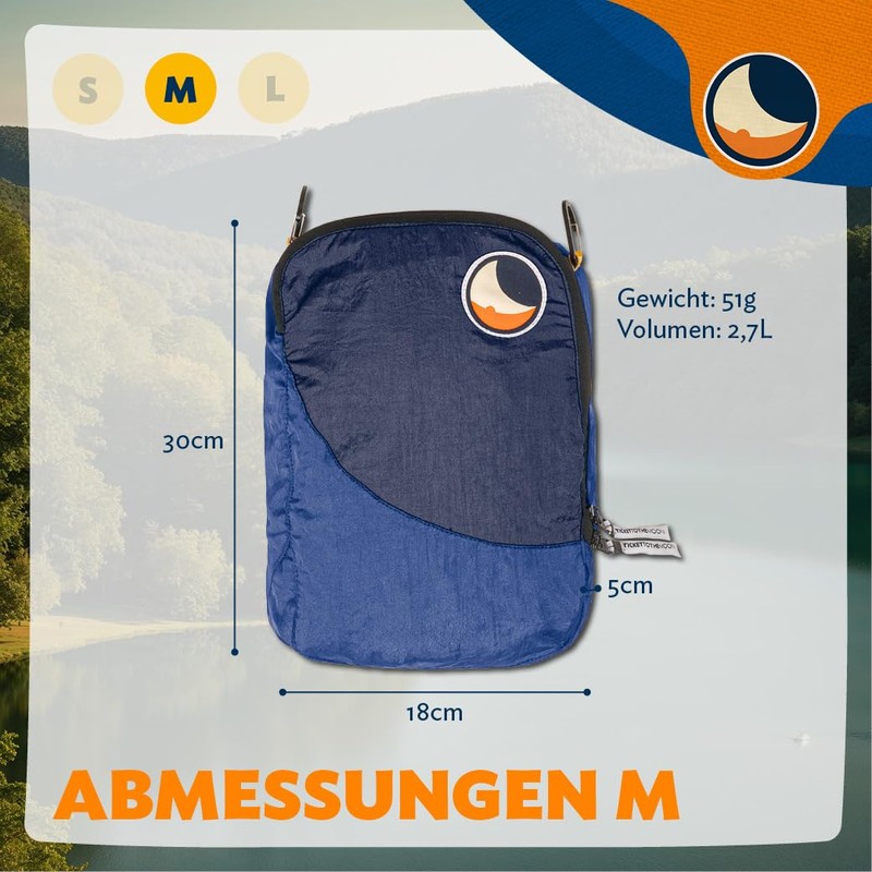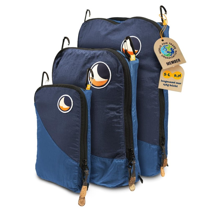 Ticket to the Moon Travel Cube Set - Blue x 3 | Outdoor Packing Cube in 3 Sizes with 4 Carabiners - Packing Bag/Suitcase Organiser for Camping and Travel Made of Parachute Nylon | Original since 1996