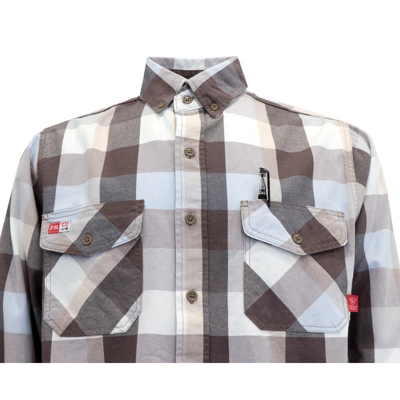 - 7OZ Plaid 100% Cotton Twill FR Treated,FR Buttons,FR Sewing Threads!Clear FR Tag on arms and bottom front.More FR info On Tag About UL Certification.