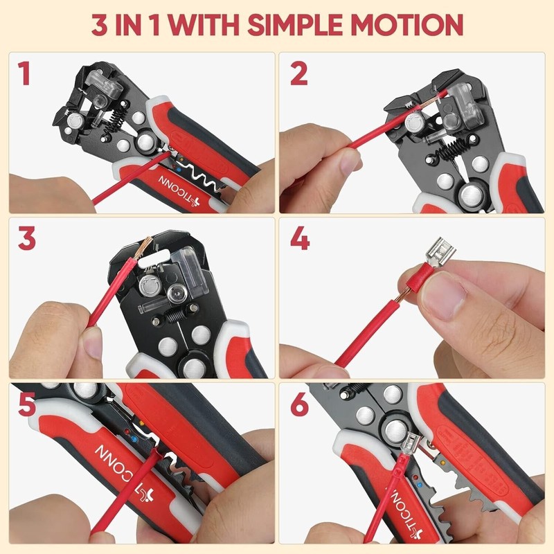 TICONN Automatic Wire Stripper Tool, 3 in 1 Wire Cutter Crimper Pliers Electrician Tools for 24-12 AWG Wire Stripper, Cutting and Crimping (Red)