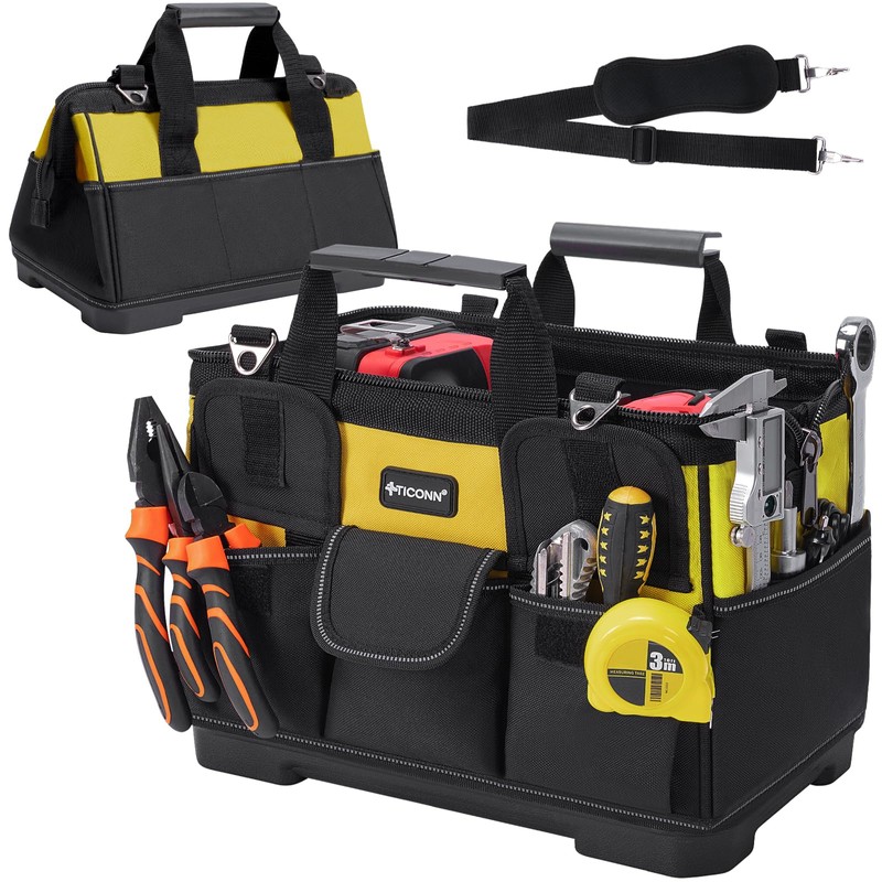 TICONN Heavy Duty Tool Bag with Multi-Pockets, Portable Tool Box Organizer Storage Bag, with Adjustable Shoulder Strap and Ergonomic Handle (Yellow, 14" Molded Base)