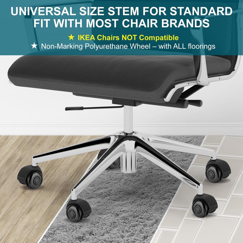 - [Universal & Premium] Designed for universal compatibility - offers a direct replacement solution for almost any rolling chair with standard stem. Made with quality and premium components, precision shielded ball bearings, wear resistant polyurethane casters. Please note that our design incorporated universal grip ring stem (7/16" x 7/8" or 11mm x22mm) which unfortunately does NOT fit IKEA chairs.