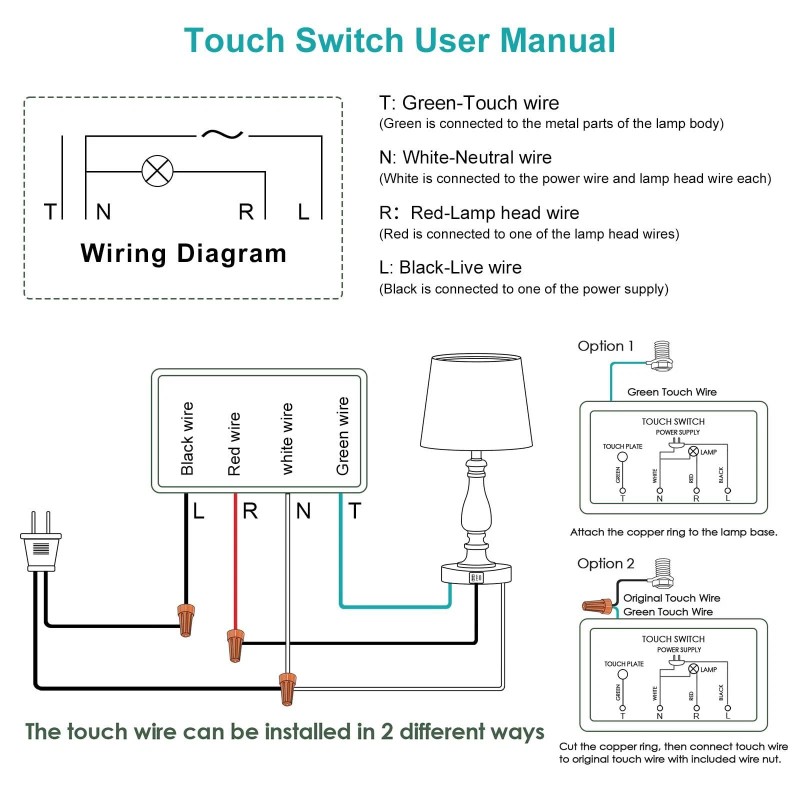 Wiring Method: The 3 way touch lamp switch is easy to install. For additional guidance, you can also watch the video provided in the listing. Note: This touch lamp replacement sensor is compatible only with metal-based lamps. The wiring method includes a simple diagram for connecting the four wires: Green (T) connects to the lamp's metal parts, White (N) connects to both the power wire and lamp head wire, Red (R) connects to one of the lamp head wires, and Black (L) connects to the power supply.
