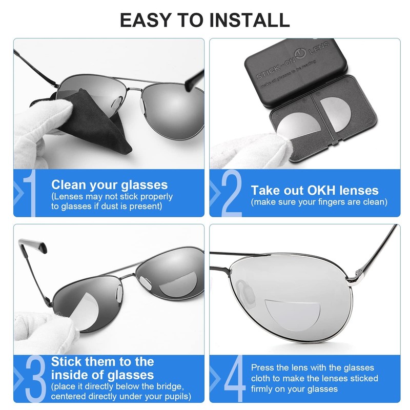 - No water required: These stick-on bifocal lenses are easy to use and no water is required. If you find that the position of the sticker is not correct, you can remove it first and reapply it.