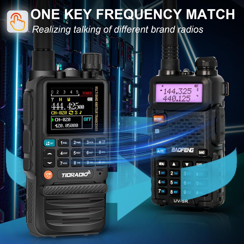 - 【Features Designed for Excellence】On the basic functions of ham radio, Tidradio H3 boasts a host of innovative features including 8-band receiving band (AM/FM reception), wireless programming, wireless radio replication, One Key Match frequency, One-click to Import Local Repeater, DTMF function, MIC gain, frog end tone, and a 1.44 -inch TFT color screen, among others. Enjoying customizable radio settings.