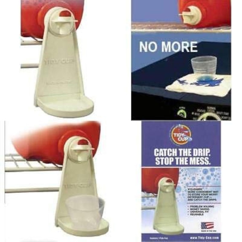 - REDESIGNED BASED ON FEEDBACK. The Tidy-Cup has been redesigned to include ridges for the detergent cup to sit above the dripping mess. Be sure to install with ridges facing upward.