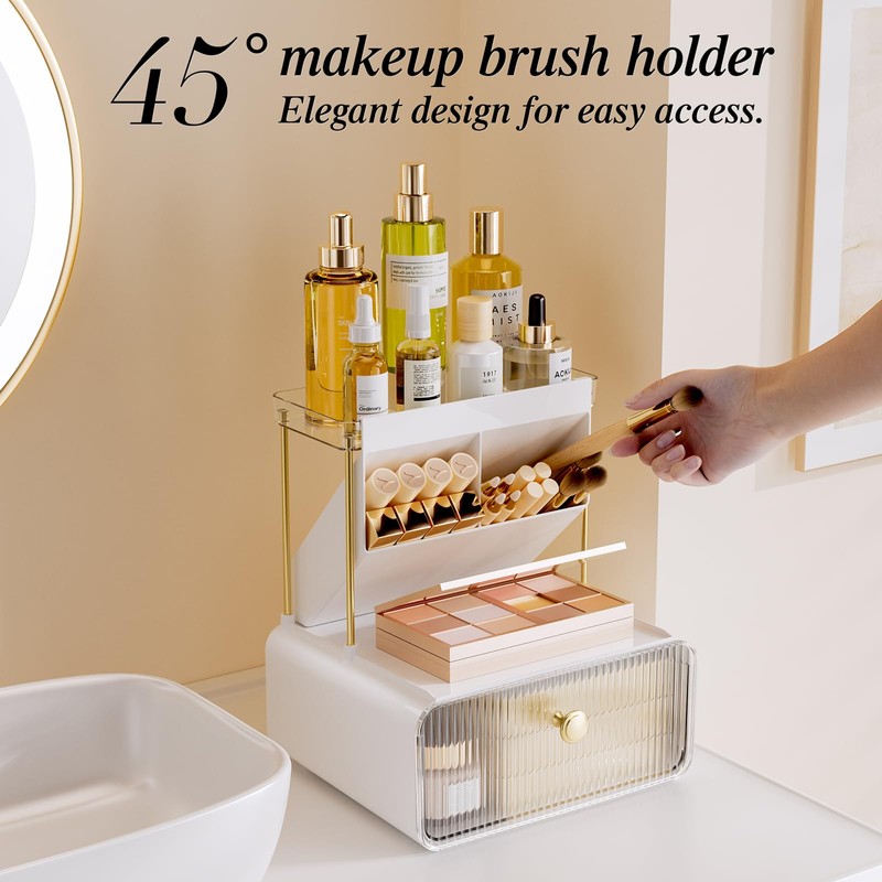 - 45° Tilt for Easy Access: The makeup organizer countertop features a unique 45° brush slot design, elegantly displaying makeup brushes on your desk for easy access. No more wasting time searching for tools—make up organizers for vanity enhance your daily routine, improving efficiency and bringing comfort and ease to your life.