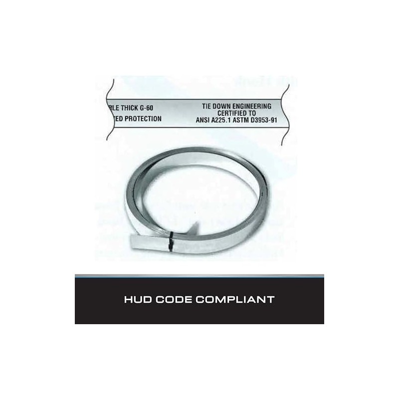 HUD Code 3280 and 3285(2) require 1-1/4” X .035” or larger steel strapping conforming to ASTM D3953-97, standard specifications for strapping, flat steel and seals. Type 1, Grade 1, Finish B, with a minimum total capacity of 4,725 lbs. and a working capacity of 3,150 lbs. marked every 5 ft. The straps must be provided with protections against weather deterioration and corrosion at least equivalent to that provided by a coating of zinc on steel of not less than .30 oz./ft. of surface coated. Slit or cut edges of coated strapping need not be zinc coated.